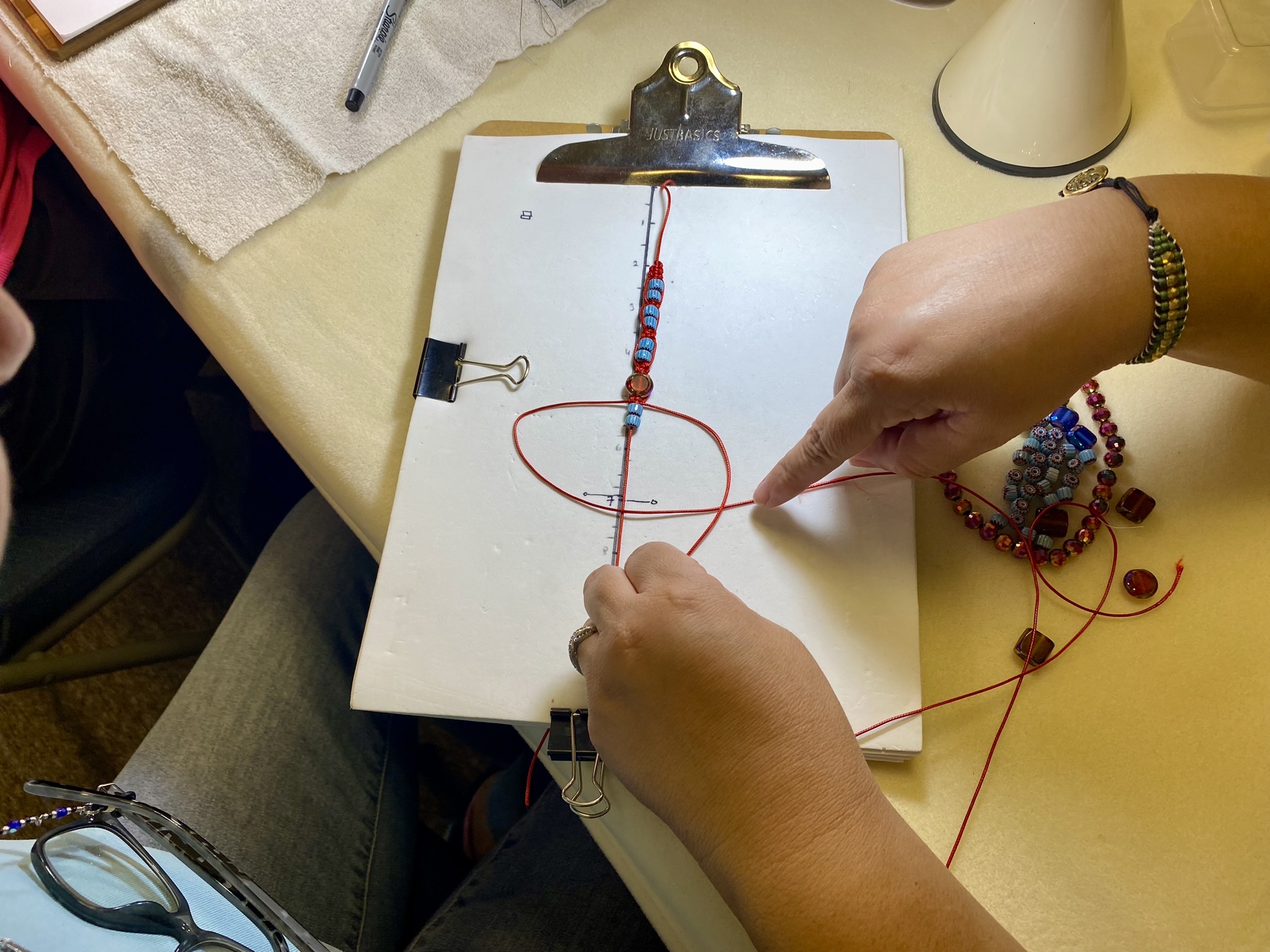 Beads, charms, nylon cord (0,5mm to 1mm). We have materials available for purchase at the store. Or you can purchase what we have on hand for $5. Please arrive early if you need to purchase items.