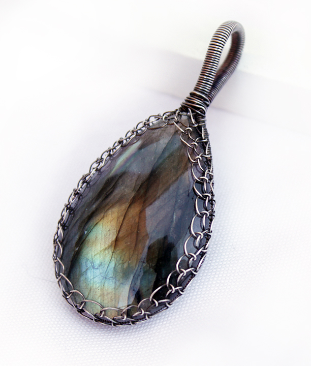In this three hour class Albina will teach you how to build a frame on the back of the pendant, weave the netting to encompass the cabochon and hold it tightly in place. The bail is wrapped and bent backwards to complete the piece.