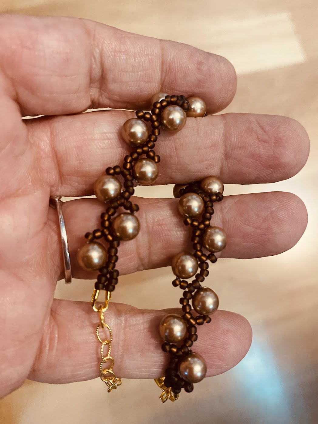 What to bring: 6mm pearls (I used 21 for a 6 1/4” bracelet), 11/0 seed beads, your needle and thread, and your favorite clasp. If you want to make it adjustable you need two wire guards, two jumprings, a lobster clasp and a bit of chain for an extender.
